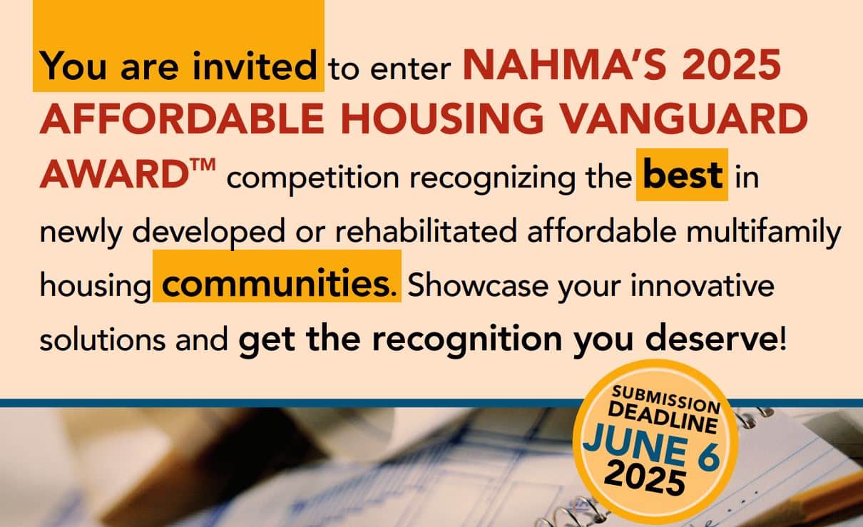 The deadline for submissions for the National Affordable Housing Management Association (NAHMA) 2026 Affordable Housing Vanguard Award is June 5, 2026. The entry fee is $150 per property for members of NAHMA or an AHMA, and $325 per property for non-members. Please reference the name of the applicant property when submitting payment, via either credit card below, or via check payable to NAHMA and mailed to NAHMA Vanguard Award, 400 N. Columbus St., Suite 203, Alexandria, VA 22314. Download the 2026 Vanguard Award application TO BEGIN PURCHASE PROCESS: Click here to select member or non-member status: